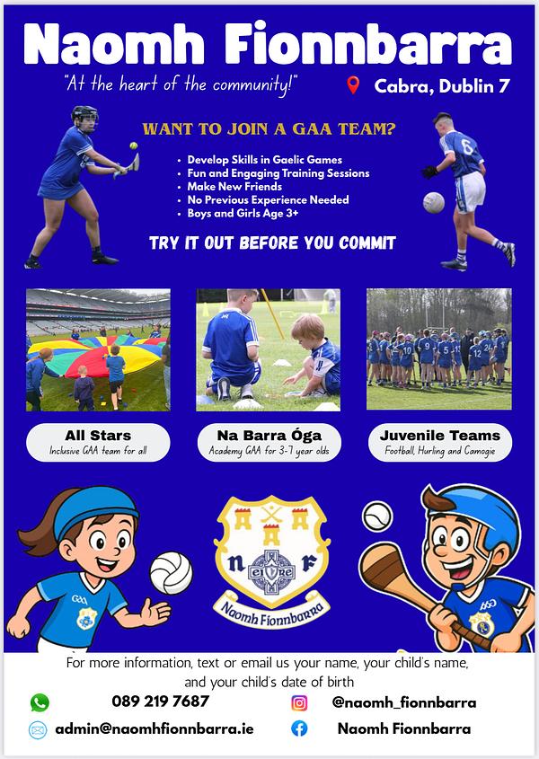 Naomh Fionnbarra is delighted to share with our members that we are launching a new recruitment drive to welcome more young players into our club and community here in Cabra, Dublin 7.