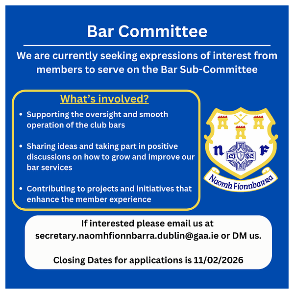 Naomh Fionnbarra GAA is inviting expressions of interest from members to help oversee and enhance our club bar services. Contribute ideas, support operations, and be part of projects that improve the member experience.